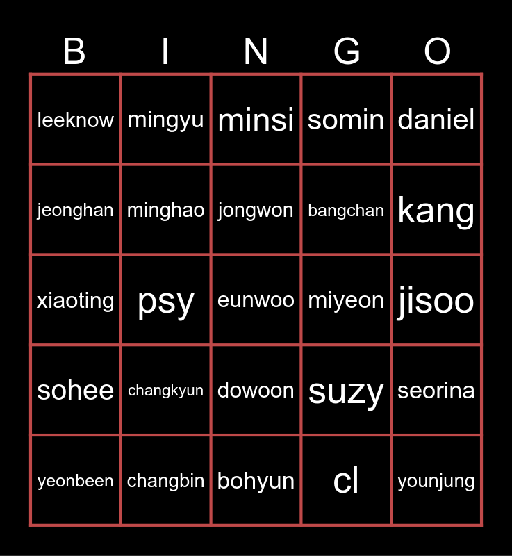 This bingo card has a free space and 24 words: changkyun, changbin, jongwon, yeonbeen, daniel, leeknow, jeonghan, mingyu, miyeon, dowoon, bangchan, xiaoting, suzy, seorina, minghao, cl, jisoo, minsi, kang, psy, younjung, sohee, somin and bohyun.