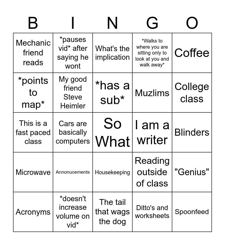 This bingo card has a free space and 31 words: The tail that wags the dog, Teach to the test, Cars are basically computers, Moguls, Mechanic friend reads, What's the implication, My good friend Steve Heimler, Reading outside of class, I am a writer, Ditto's and worksheets, Blinders, Spoonfeed, Lose that mindset, A lot of sophomores, College class, 93% passed, "Genius", Annonucements, Microwave, Housekeeping, Coffee, Don't coast, Acronyms, *pauses vid* after saying he wont, Muzlims, *points to map*, *Walks to where you are sitting only to look at you and walk away*, This is a fast paced class, *doesn't increase volume on vid*, *has a sub* and *walks out of class/doesn't come to class on time*.