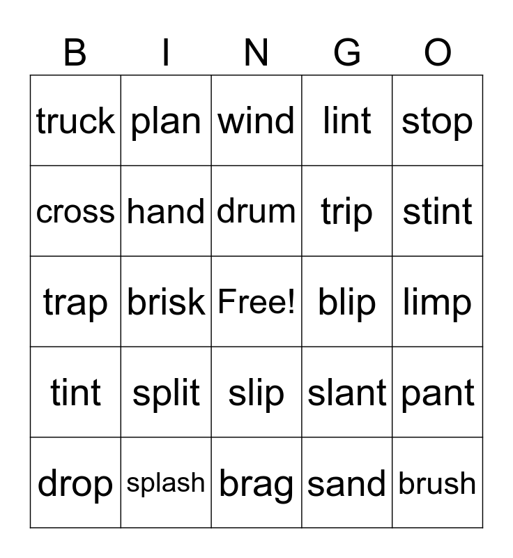 This bingo card has a free space and 24 words: split, splash, drum, drop, stop, truck, cross, plan, blip, slip, trip, trap, slant, pant, hand, sand, limp, wind, stint, brisk, brush, tint, lint and brag.
