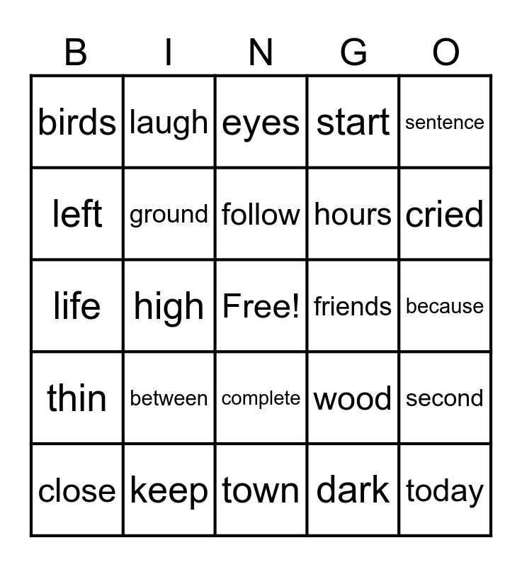 This bingo card has a free space and 24 words: between, keep, follow, close, sentence, birds, left, laugh, friends, complete, hours, life, wood, second, ground, dark, because, eyes, cried, high, today, thin, start and town.