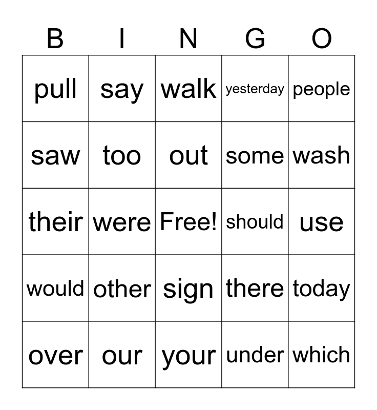 This bingo card has a free space and 24 words: other, our, out, over, people, pull, saw, say, should, sign, some, their, there, today, too, under, use, walk, wash, were, which, would, yesterday and your.
