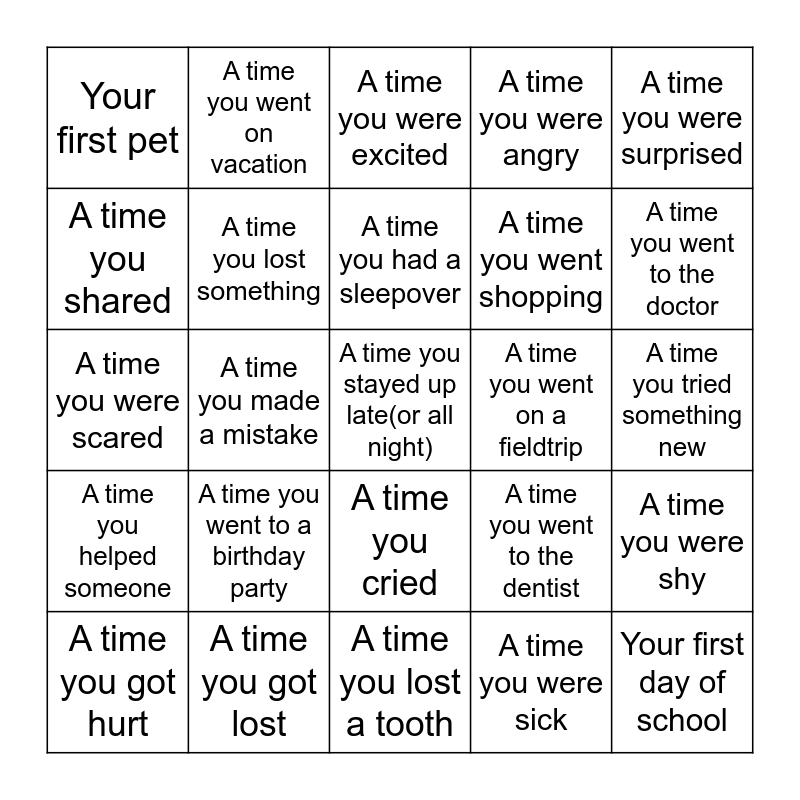 This bingo card has 25 words: A time you went to a birthday party, A time you lost a tooth, A time you had a sleepover, A time you got hurt, A time you were surprised, Your first pet, A time you shared, A time you went on vacation, A time you went on a fieldtrip, A time you cried, A time you went shopping, A time you were scared, A time you went to the dentist, A time you were shy, A time you lost something, Your first day of school, A time you tried something new, A time you were excited, A time you went to the doctor, A time you made a mistake, A time you stayed up late(or all night), A time you got lost, A time you helped someone, A time you were angry and A time you were sick.