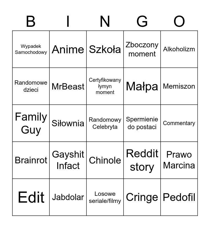 This bingo card has 26 words: Chinole, Cringe, Certyfikowany łymyn moment, Jabdolar, Alkoholizm, Wypadek Samochodowy, Randomowe dzieci, Anime, Commentary, Reddit story, Małpa, Family Guy, Prawo Marcina, Edit, Siłownia, Zbyt gejowy moment, Zboczony moment, Brainrot, Szkoła, Randomowy Celebryta, Memiszon, Losowe seriale/filmy, Spermienie do postaci, Gayshit Infact, MrBeast and Pedofil.