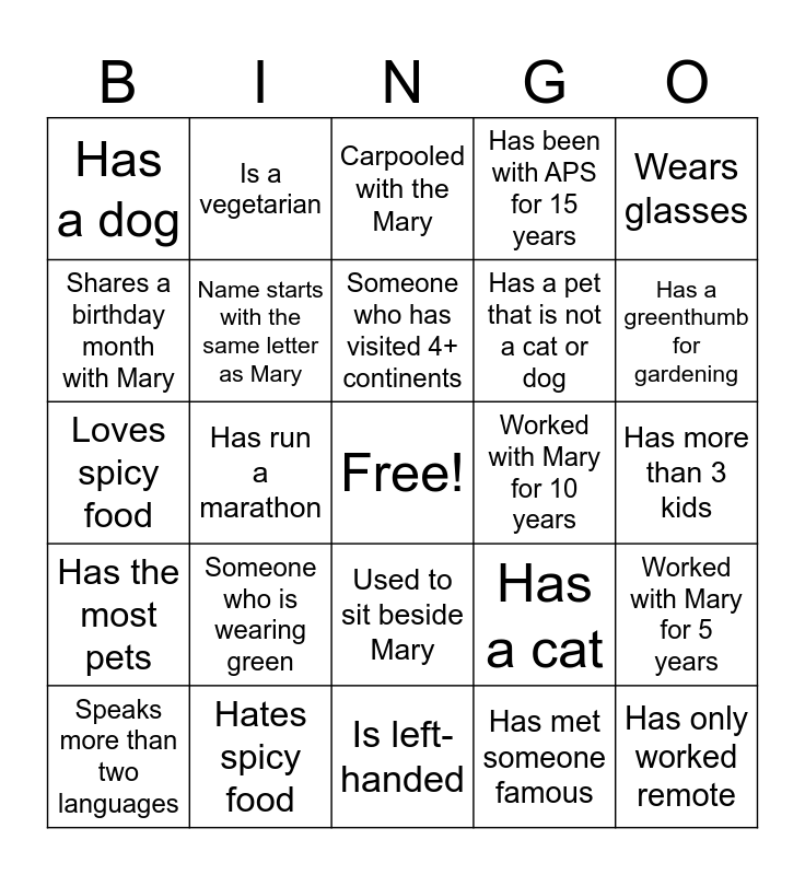This bingo card has a free space and 25 words: Has the most pets, Hates spicy food, Is left-handed, Has met someone famous, Wears glasses, Has a dog, Is a vegetarian, Carpooled with the Mary, Worked with Mary for 10 years, Worked with Mary for 5 years, Shares a birthday month with Mary, Name starts with the same letter as Mary, Has worked at APS for 5 years, Has a cat, Has a greenthumb for gardening, Speaks more than two languages, Has run a marathon, Someone who has visited 4+ continents, Has a pet that is not a cat or dog, Has more than 3 kids, Loves spicy food, Someone who is wearing green, Used to sit beside Mary, Has been with APS for 15 years and Has only worked remote.