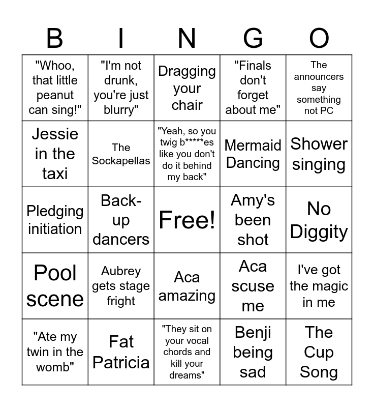 This bingo card has a free space and 24 words: Aubrey gets stage fright, Fat Patricia, "Yeah, so you twig b*****es like you don't do it behind my back", "Ate my twin in the womb", The announcers say something not PC, "Whoo, that little peanut can sing!", Jessie in the taxi, "I'm not drunk, you're just blurry", Amy's been shot, Aca amazing, Mermaid Dancing, Pledging initiation, Aca scuse me, I've got the magic in me, The Sockapellas, Benji being sad, No Diggity, Dragging your chair, Shower singing, Back-up dancers, The Cup Song, Pool scene, "Finals don't forget about me" and "They sit on your vocal chords and kill your dreams".