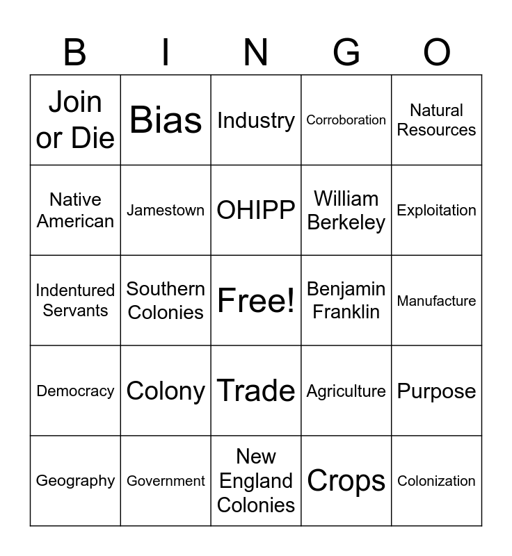 This bingo card has a free space and 29 words: Geography, Bacon's Rebellion, Southern Colonies, Economy, Join or Die, Industry, Jamestown, Colony, Benjamin Franklin, Government, Manufacture, Colonization, New England Colonies, Crops, Exploitation, Tobacco, Trade, Democracy, Natural Resources, Indentured Servants, Agriculture, Middle Colonies, William Berkeley, Native American, Corroboration, Bias, Purpose, OHIPP and 5W's.