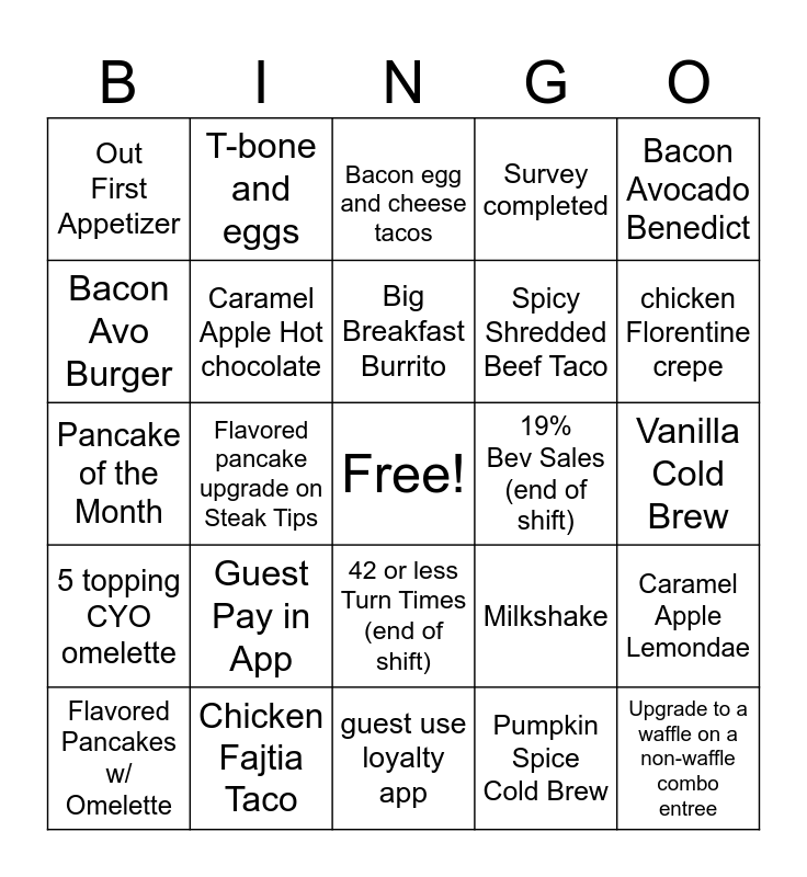 This bingo card has a free space and 24 words: Guest Pay in App, Chicken Fajtia Taco, Big Breakfast Burrito, Flavored Pancakes w/ Omelette, Bacon Avocado Benedict, Out First Appetizer, Bacon Avo Burger, T-bone and eggs, 19% Bev Sales (end of shift), 42 or less Turn Times (end of shift), Spicy Shredded Beef Taco, Pancake of the Month, Milkshake, Caramel Apple Lemondae, Caramel Apple Hot chocolate, Pumpkin Spice Cold Brew, Vanilla Cold Brew, Bacon egg and cheese tacos, chicken Florentine crepe, Flavored pancake upgrade on Steak Tips, Upgrade to a waffle on a non-waffle combo entree, 5 topping CYO omelette, Survey completed and guest use loyalty app.