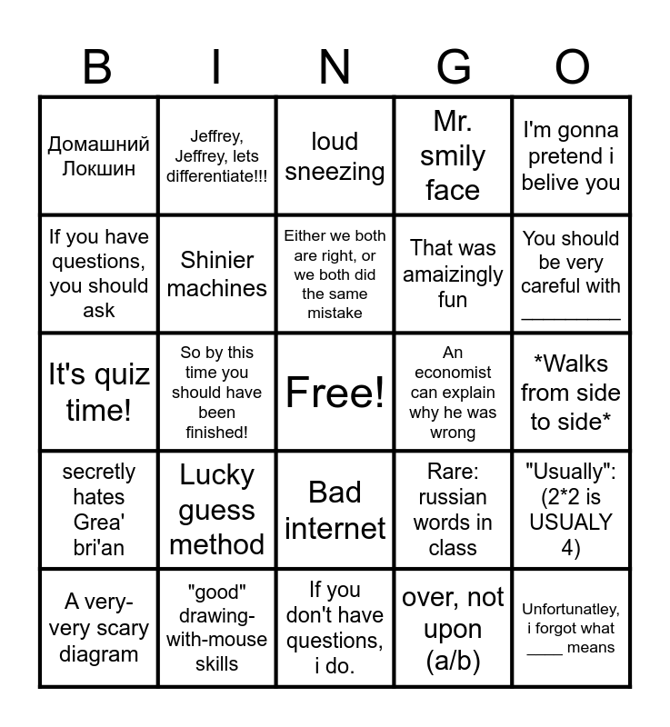 This bingo card has a free space and 24 words: Lucky guess method, "good" drawing-with-mouse skills, Either we both are right, or we both did the same mistake, A very-very scary diagram, I'm gonna pretend i belive you, Домашний Локшин, If you have questions, you should ask, Jeffrey, Jeffrey, lets differentiate!!!, An economist can explain why he was wrong, Bad internet, That was amaizingly fun, It's quiz time!, Rare: russian words in class, "Usually": (2*2 is USUALY 4), Shinier machines, over, not upon (a/b), *Walks from side to side*, loud sneezing, You should be very careful with _________, So by this time you should have been finished!, Unfortunatley, i forgot what ____ means, secretly hates Grea' bri'an, Mr. smily face and If you don't have questions, i do..