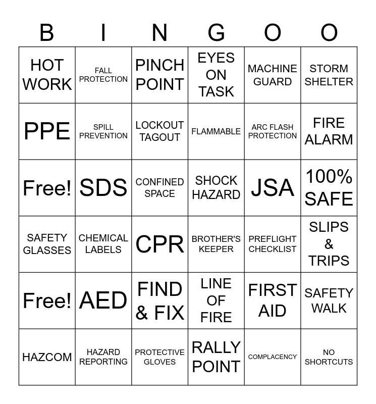 This bingo card has 36 words: LINE OF FIRE, FIND & FIX, RALLY POINT, PPE, SAFETY GLASSES, SHOCK HAZARD, SPILL PREVENTION, PROTECTIVE GLOVES, MACHINE GUARD, FIRST AID, FIRE ALARM, EYES ON TASK, SAFETY WALK, SDS, FLAMMABLE, HOT WORK, Free!, JSA, Free!, PINCH POINT, CONFINED SPACE, CHEMICAL LABELS, BROTHER'S KEEPER, CPR, PREFLIGHT CHECKLIST, FALL PROTECTION, ARC FLASH PROTECTION, HAZARD REPORTING, LOCKOUT TAGOUT, STORM SHELTER, NO SHORTCUTS, HAZCOM, SLIPS & TRIPS, 100% SAFE, AED and COMPLACENCY.