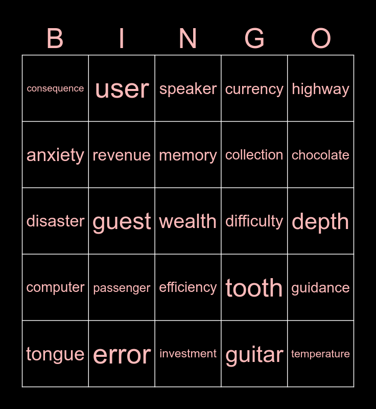 This bingo card has 25 words: passenger, investment, memory, tongue, highway, consequence, anxiety, user, difficulty, efficiency, collection, disaster, tooth, guidance, revenue, temperature, depth, speaker, chocolate, guest, wealth, error, computer, currency and guitar.