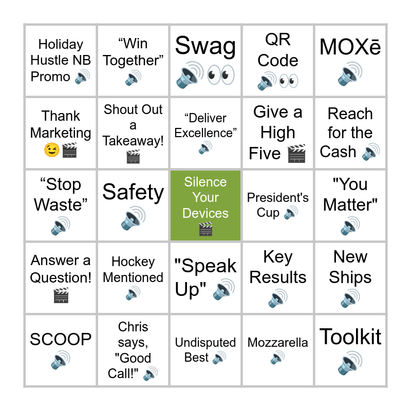 This bingo card has a free space and 34 words: Labor Saving π, Mozzarella π, Pizza Boxes ππ, Boneless Wingsπ, Answer a Question! π¬, Shout Out a Takeaway! π¬, MOXΔ π, SCOOP π, βWin Togetherβ π, RFTC Sprint Winners ππ, βDeliver Excellenceβ π, Swag ππ, Tonee Picked On π, Exclusive Brand π, President's Cup π, Reach for the Cash π, Chris says, "Good Call!" π, βStop Wasteβ π, Hockey Mentioned π, Key Results π, "Speak Up" π, Thanksgiving Flyer π, Holiday Hustle NB Promo π, "You Matter" π, Undisputed Best π, Toolkit π, QR Code ππ, Give a Kudos π¬, Give a High Five π¬, Thank Marketing ππ¬, Round of Applause π¬, Safety π, New Ships π and MORE Campaign ππ.