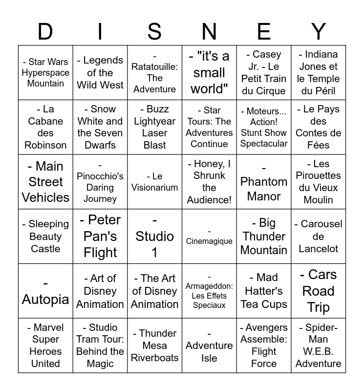 This bingo card has 51 words: - Disneyland Railroad, - Main Street Vehicles, - Horse-Drawn Streetcars, - Big Thunder Mountain, - Phantom Manor, - Thunder Mesa Riverboats, - Legends of the Wild West, - Pirates of the Caribbean, - Indiana Jones et le Temple du Péril, - Adventure Isle, - La Cabane des Robinson, - "it's a small world", - Peter Pan's Flight, - Sleeping Beauty Castle, - Alice's Curious Labyrinth, - Mad Hatter's Tea Cups, - Snow White and the Seven Dwarfs, - Pinocchio's Daring Journey, - Dumbo the Flying Elephant, - Casey Jr. - Le Petit Train du Cirque, - Le Pays des Contes de Fées, - Carousel de Lancelot, - Star Wars Hyperspace Mountain, - Buzz Lightyear Laser Blast, - Orbitron, - Autopia, - Star Tours: The Adventures Continue, - Les Mystères du Nautilus, - Studio 1, - Ratatouille: The Adventure, - Crush's Coaster, - Cars Road Trip, - Flying Carpets Over Agrabah, - The Twilight Zone Tower of Terror, - Studio Tram Tour: Behind the Magic, - Cinemagique, - The Art of Disney Animation, - Avengers Assemble: Flight Force, - Spider-Man W.E.B. Adventure, - Captain EO, - Le Visionarium, - Honey, I Shrunk the Audience!, - Space Mountain: De la Terre à la Lune, - Rock 'n' Roller Coaster avec Aerosmith, - Art of Disney Animation, - Armageddon: Les Effets Speciaux, - Moteurs... Action! Stunt Show Spectacular, - Marvel Super Heroes United, - Studio Tram Tour: Behind the Magic, - Les Pirouettes du Vieux Moulin and - The Chaparral Theater.