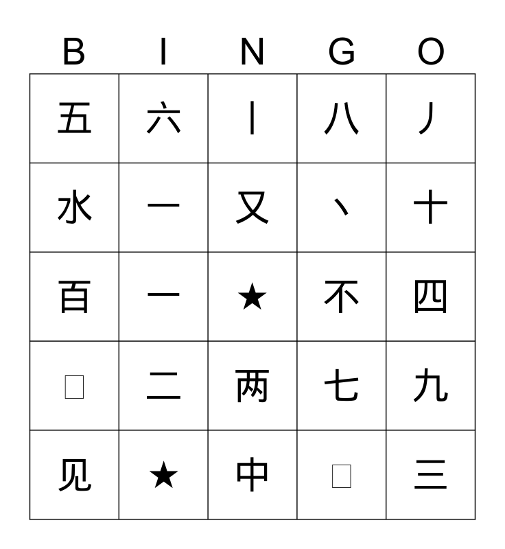 This bingo card has a free space and 24 words: 二, ★, 又, 见, 丿, 五, 水, 六, 不, 两, 丶, 百, 七, 九, 一, ㇏, 四, 丨, 十, 一, 三, ㇄, 八 and 中.
