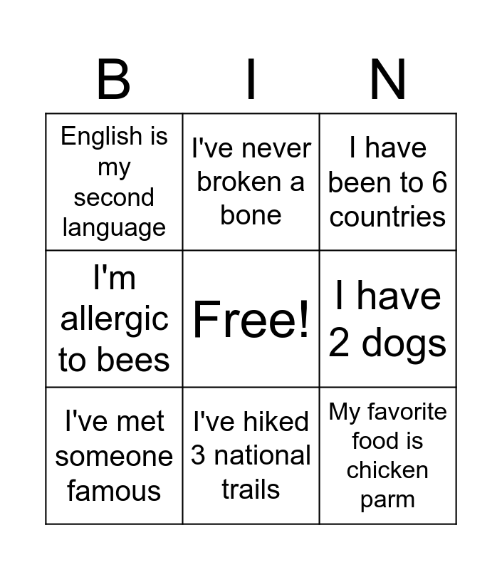 This bingo card has a free space and 8 words: I have 2 dogs, I have been to 6 countries, I've never broken a bone, I've met someone famous, English is my second language, My favorite food is chicken parm, I'm allergic to bees and I've hiked 3 national trails.