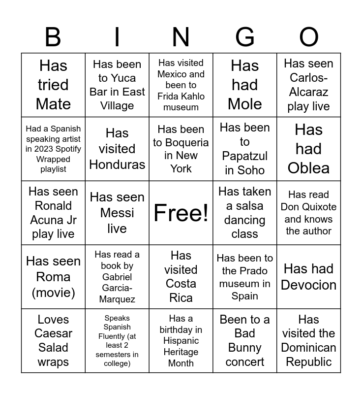 This bingo card has a free space and 30 words: Speaks Spanish Fluently (at least 2 semesters in college), Studied abroad in a Spanish speaking country, Has seen Messi live, Has tried Horchata, Has tried Mate, Has visited Mexico and been to Frida Kahlo museum, Has visited Honduras, Has visited Costa Rica, Has taken a salsa dancing class, Has a birthday in Hispanic Heritage Month, Has read Don Quixote and knows the author, Has visited the Dominican Republic, Been to a Bad Bunny concert, Has been to carnival in Colombia, Has had Oblea, Had or been to a Quincinera, Has been to the Prado museum in Spain, Has seen Roma (movie), Has read a book by Gabriel Garcia-Marquez, Has seen Carlos-Alcaraz play live, Has seen Ronald Acuna Jr play live, Has seen Bacilos live, Has been to Yuca Bar in East Village, Has been to Papatzul in Soho, Had a Spanish speaking artist in 2023 Spotify Wrapped playlist, Has had Mole, Has had Devocion, Loves Caesar Salad wraps, Has been to Boqueria in New York and Watched Rebeca Andrade take the gold medal at the Paris Olympics for the floor routine.