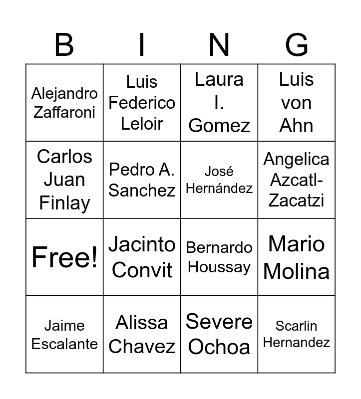 This bingo card has 20 words: Mario Molina, Ellen Ochoa, Laura I. Gomez, Albert Baez, Jaime Escalante, Carlos Juan Finlay, Alissa Chavez, Alejandro Zaffaroni, Free!, Luis Federico Leloir, Jacinto Convit, Bernardo Houssay, Pedro A. Sanchez, Scarlin Hernandez, José Hernández, César Milstein, Angelica Azcatl-Zacatzi, Luis von Ahn, Severe Ochoa and Sabrina Gonzalez Pasterski.