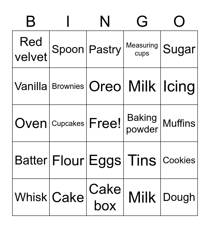 This bingo card has a free space and 24 words: Flour, Cake, Oreo, Whisk, Sugar, Red velvet, Vanilla, Spoon, Baking powder, Eggs, Milk, Oven, Tins, Cookies, Brownies, Milk, Muffins, Pastry, Icing, Cupcakes, Dough, Batter, Measuring cups and Cake box.