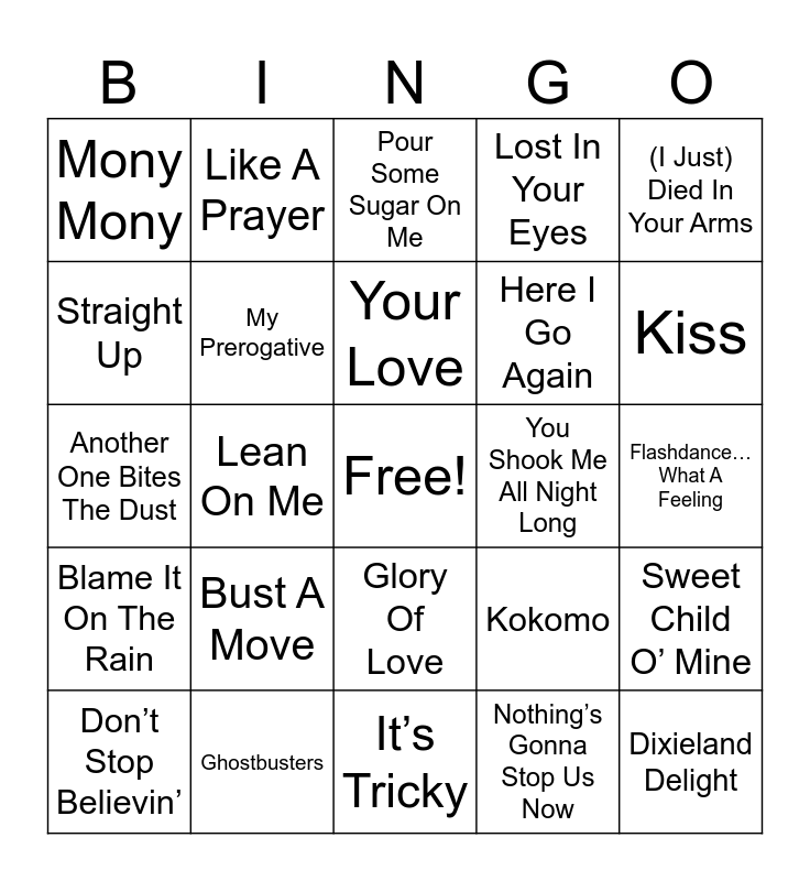 This bingo card has a free space and 50 words: All My Ex’s Live In Texas, Dixieland Delight, 9 To 5, It’s Tricky, Bust A Move, Wild Thing, Like A Prayer, Every Rose Has Its Thorn, Straight Up, Hangin’ Tough, My Prerogative, Lost In Your Eyes, Sweet Child O’ Mine, Kokomo, Walk Like An Egyptian, Wanted Dead Or Alive, Your Love, You Shook Me All Night Long, With Or Without You, (I Just) Died In Your Arms, Lean On Me, Nothing’s Gonna Stop Us Now, Mony Mony, Here I Go Again, (I’ve Had) The Time Of My Life, Kyrie, Kiss, The Safety Dance, Pour Some Sugar On Me, Glory Of Love, Can’t Fight This Feeling, The Power Of Love, The Final Countdown, Footloose, Ghostbusters, I Just Called To Say I Love You, Maneater, Africa, Billie Jean, Flashdance… What A Feeling, Eye Of The Tiger, Jack & Diane, I Love Rock ‘N’ Roll, Jessie’s Girl, Don’t Stop Believin’, Another One Bites The Dust, In The Air Tonight, Rhythm Nation, Blame It On The Rain and Got My Mind Set On You.