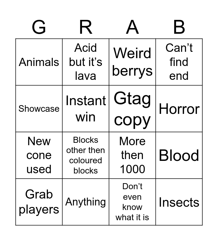This bingo card has 16 words: Anything, Blood, Weird berrys, Animals, New cone used, Acid but it’s lava, More then 1000, Don’t even know what it is, Showcase, Instant win, Grab players, Can’t find end, Blocks other then coloured blocks, Horror, Gtag copy and Insects.