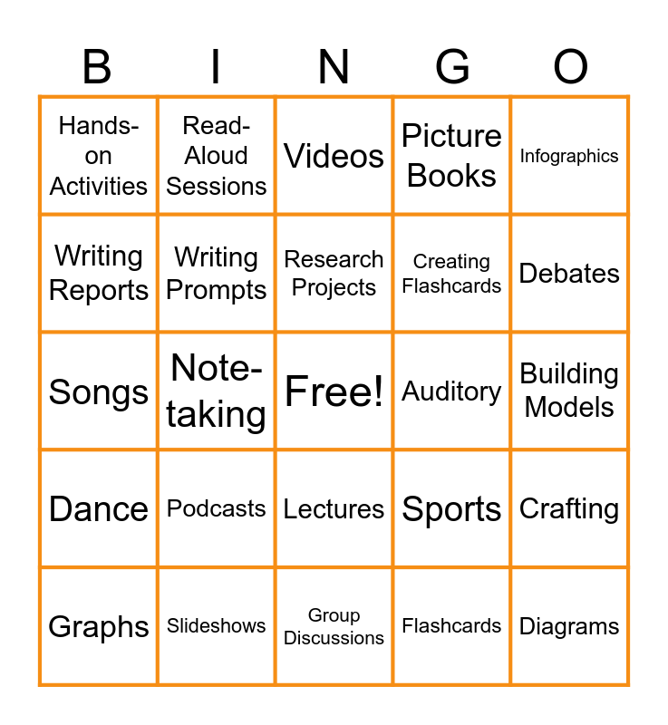 This bingo card has a free space and 44 words: Visual, Diagrams, Charts, Graphs, Mind Maps, Flashcards, Videos, Posters, Infographics, Slideshows, Picture Books, Auditory, Lectures, Podcasts, Audiobooks, Group Discussions, Oral Presentations, Songs, Rhymes, Debates, Read-Aloud Sessions, Storytelling, Kinesthetic, Hands-on Activities, Experiments, Building Models, Role Play, Field Trips, Sports, Dance, Movement Breaks, Crafting, Interactive Simulations, Reading/Writing, Note-taking, Journaling, Essays, Reading Assignments, Research Projects, Writing Reports, Creating Flashcards, Reading Comprehension Exercises, Writing Prompts and Book Summaries.