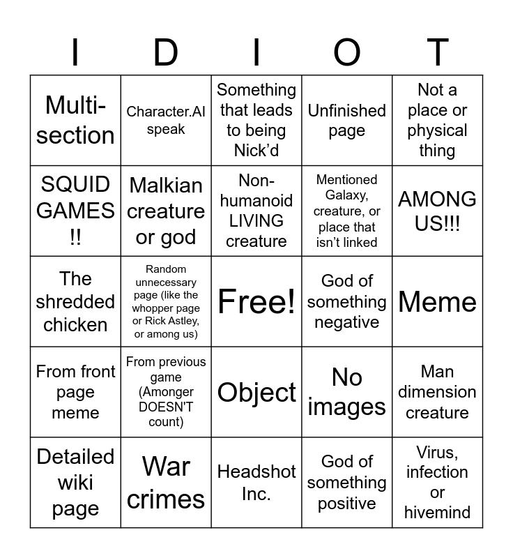 This bingo card has a free space and 24 words: From previous game (Amonger DOESN'T count), War crimes, Non-humanoid LIVING creature, Detailed wiki page, Not a place or physical thing, Multi-section, SQUID GAMES !!, Character.AI speak, God of something negative, Object, Mentioned Galaxy, creature, or place that isn’t linked, The shredded chicken, No images, Man dimension creature, Malkian creature or god, God of something positive, Meme, Something that leads to being Nick’d, AMONG US!!!, Random unnecessary page (like the whopper page or Rick Astley, or among us), Virus, infection or hivemind, From front page meme, Unfinished page and Headshot Inc..