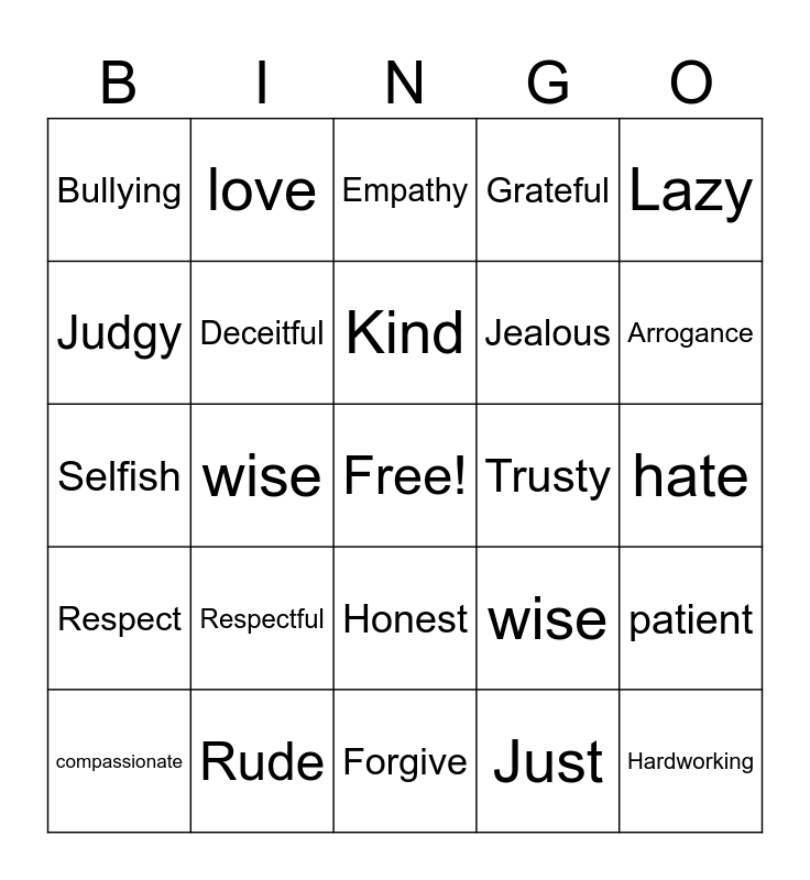This bingo card has a free space and 26 words: Honest, Just, Kind, Rude, Lazy, Bullying, Judgy, love, hate, wise, Jealous, Selfish, patient, compassionate, wise, Encouraging, Grateful, Respect, Empathy, Hardworking, Arrogance, Forgive, Trusty, Respectful, Deceitful and Caring.