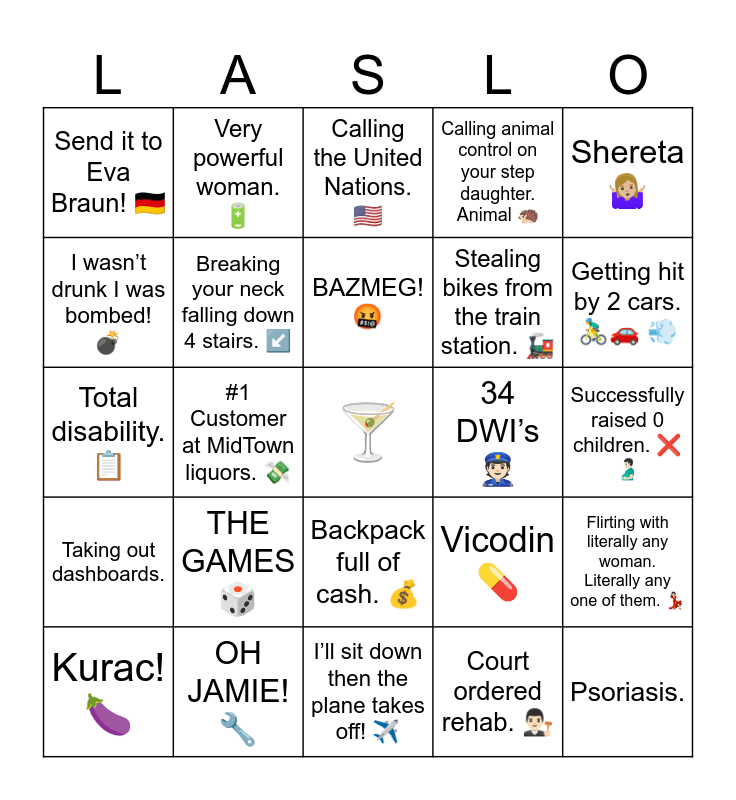 This bingo card has a free space and 24 words: THE GAMES 🎲, OH JAMIE! 🔧, BAZMEG! 🤬, Kurac! 🍆, Shereta 🤷🏼♀️, Send it to Eva Braun! 🇩🇪, I wasn’t drunk I was bombed! 💣, Very powerful woman. 🔋, 34 DWI’s 👮🏻, Backpack full of cash. 💰, Stealing bikes from the train station. 🚂, Total disability. 📋, Vicodin 💊, Flirting with literally any woman. Literally any one of them. 💃🏻, Breaking your neck falling down 4 stairs. ↙️, Court ordered rehab. 👨🏻⚖️, Successfully raised 0 children. ❌🫃🏻, Calling the United Nations. 🇺🇸, Getting hit by 2 cars. 🚴♂️🚗 💨, #1 Customer at MidTown liquors. 💸, Psoriasis., Taking out dashboards., Calling animal control on your step daughter. Animal 🦔 and I’ll sit down then the plane takes off! ✈️.
