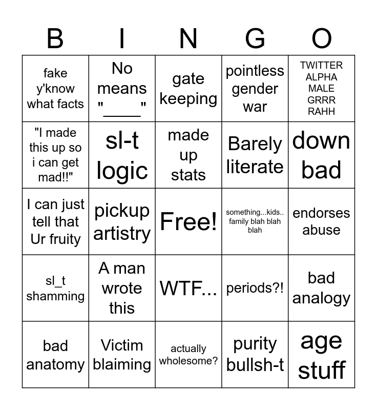 This bingo card has a free space and 24 words: A man wrote this, Victim blaiming, made up stats, bad anatomy, TWITTER ALPHA MALE GRRR RAHH, fake y'know what facts, "I made this up so i can get mad!!", No means "____", something...kids.. family blah blah blah, WTF..., Barely literate, I can just tell that Ur fruity, periods?!, bad analogy, sl-t logic, purity bullsh-t, endorses abuse, gate keeping, down bad, pickup artistry, age stuff, sl_t shamming, pointless gender war and actually wholesome?.