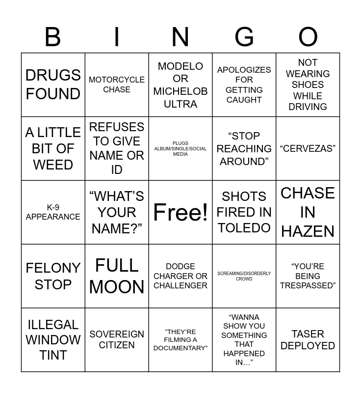This bingo card has a free space and 45 words: CAR IS A GARBAGE CAN, TASER DEPLOYED, PULL UP YOUR PANTS, ILLEGAL WINDOW TINT, ILL-FITTING OUTFIT, “WANNA SHOW YOU SOMETHING THAT HAPPENED IN…”, MODELO OR MICHELOB ULTRA, CAR SMELLS LIKE WEED, NOT WEARING SHOES WHILE DRIVING, SOVEREIGN CITIZEN, APOLOGIZES FOR GETTING CAUGHT, SHOTS FIRED IN TOLEDO, DODGE CHARGER OR CHALLENGER, FULL MOON, OPEN CONTAINER, “THEY’RE FILMING A DOCUMENTARY”, VISIBLE UNDERPANTS, K-9 APPEARANCE, OHIO TRIPLE PLAY, “CERVEZAS”, MOTORCYCLE CHASE, “THAT’S NOT MINE”, NO ID, DRUGS FOUND, “THIS IS A CIVIL MATTER”, CHASE IN HAZEN, “DETAINED NOT ARRESTED”, “AM I BEING ARRESTED”, SCREAMING/DISORDERLY CROWD, FELONY STOP, “WHAT DID I DO?”, “YOU’RE BEING TRESPASSED”, “GET ON THE GROUND”, “IDINTDONUFFIN”, DRUGS IN UNDERWEAR/BRA, “WHAT’S YOUR NAME?”, “I WANT TO TALK TO YOUR SUPERVISOR/SGT/LT”, “WHAT ARE YOU REACHING FOR?”, “WHAT ARE YOU TAKING?”, PLUGS ALBUM/SINGLE/SOCIAL MEDIA, A LITTLE BIT OF WEED, “STOP REACHING AROUND”, “DO YOU HAVE ANY DRUGS/GUNS/BOMBS?”, REFUSES TO GIVE NAME OR ID and HELICOPTER SEARCHING FOR FLEEING SUBJECT.