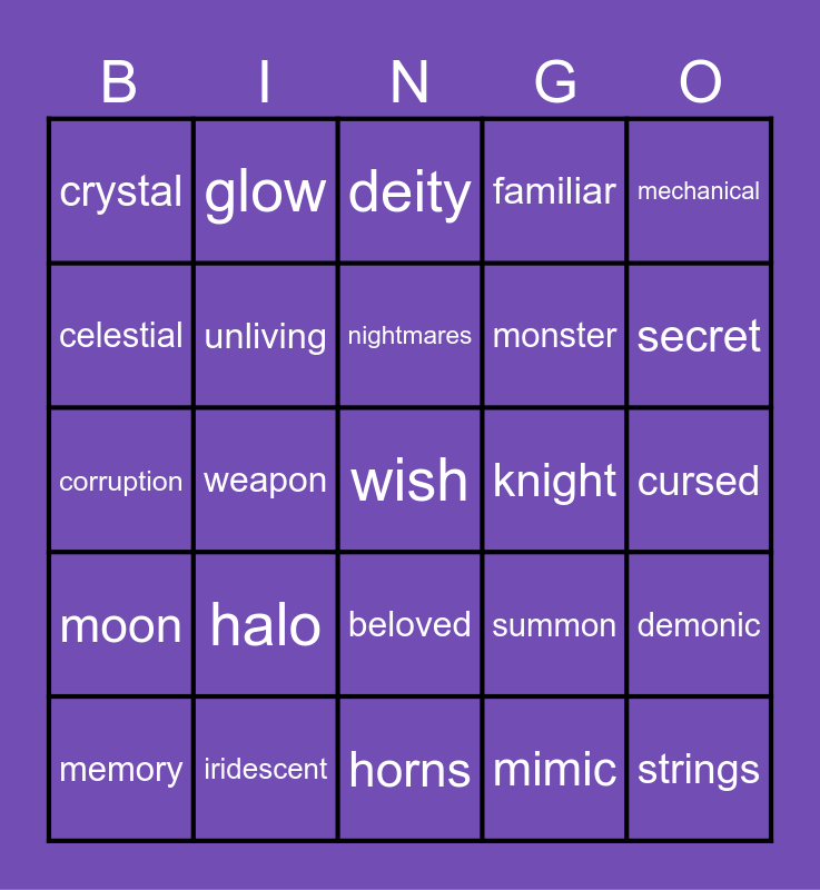 This bingo card has 31 words: horns, mask, weapon, tragedy, crystal, deity, unliving, summon, knight, mimic, cursed, wish, strings, wings, secret, potion, demonic, halo, moon, beloved, mechanical, jester, memory, glow, monster, celestial, familiar, corruption, iridescent, nightmares and flowers.