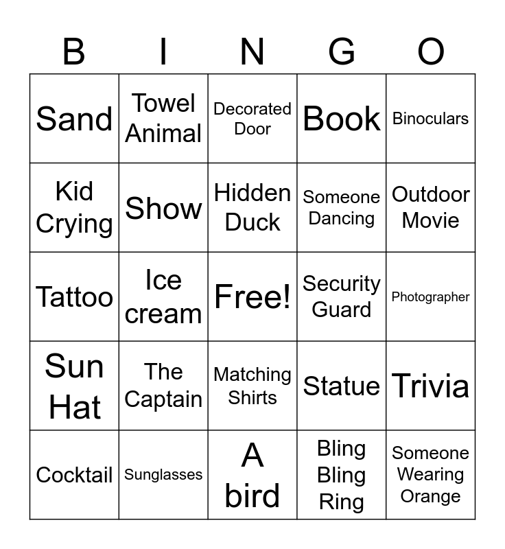 This bingo card has a free space and 24 words: The Captain, Sunglasses, Hidden Duck, Cocktail, Binoculars, Sand, Kid Crying, Towel Animal, Security Guard, Matching Shirts, Someone Dancing, Tattoo, Statue, Trivia, Show, Bling Bling Ring, Photographer, Decorated Door, Outdoor Movie, Ice cream, Someone Wearing Orange, Sun Hat, Book and A bird.