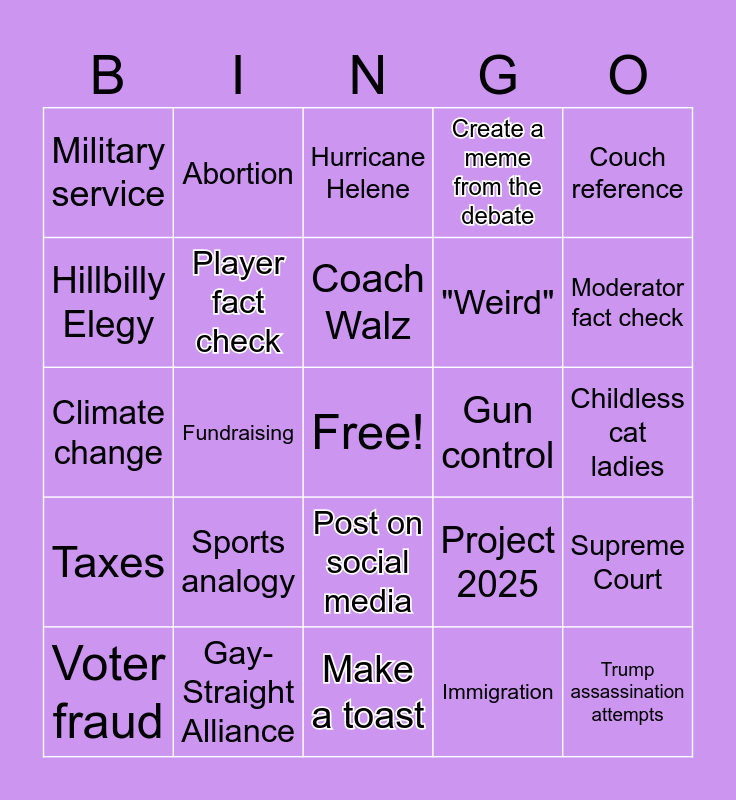 This bingo card has a free space and 29 words: Inflation, Gay-Straight Alliance, Hurricane Helene, "Black jobs", Couch reference, Military service, Player fact check, Coach Walz, Gun control, Supreme Court, Voter fraud, Fundraising, Immigration, Trump assassination attempts, Climate change, Education, Make a toast, Project 2025, Moderator fact check, Taxes, Sports analogy, The border, "Weird", Childless cat ladies, Hillbilly Elegy, Abortion, Post on social media, Create a meme from the debate and Finish your drink.