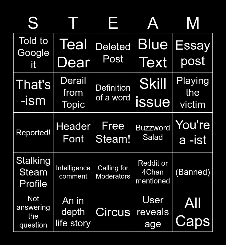 This bingo card has a free space and 37 words: Troll Post, Bait Post, Getting Political, Derail from Topic, (Banned), Intelligence comment, Definition of a word, Anime Profile Pic, Essay post, Wiki Article, Header Font, Blue Text, All Caps, You're a -ist, That's -ism, Stalking Steam Profile, Baseless accusation, Deleted Post, Calling for Moderators, Buzzword Salad, Told to Google it, Playing the victim, Not answering the question, Circus, Modified quote, User reveals age, Teal Dear, Called out for game ownership, Terrible Punctuation, Grammar or misspelling, Schizo Posting, An in depth life story, Reported!, Gen Z lingo, Reddit or 4Chan mentioned, Skill issue and Sarcasm /s.