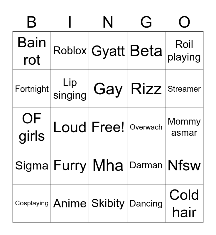 This bingo card has a free space and 24 words: Furry, Anime, Gay, Cosplaying, Roil playing, Bain rot, Fortnight, Roblox, Overwach, Mha, Rizz, OF girls, Darman, Nfsw, Lip singing, Dancing, Mommy asmar, Gyatt, Streamer, Loud, Cold hair, Sigma, Beta and Skibity.
