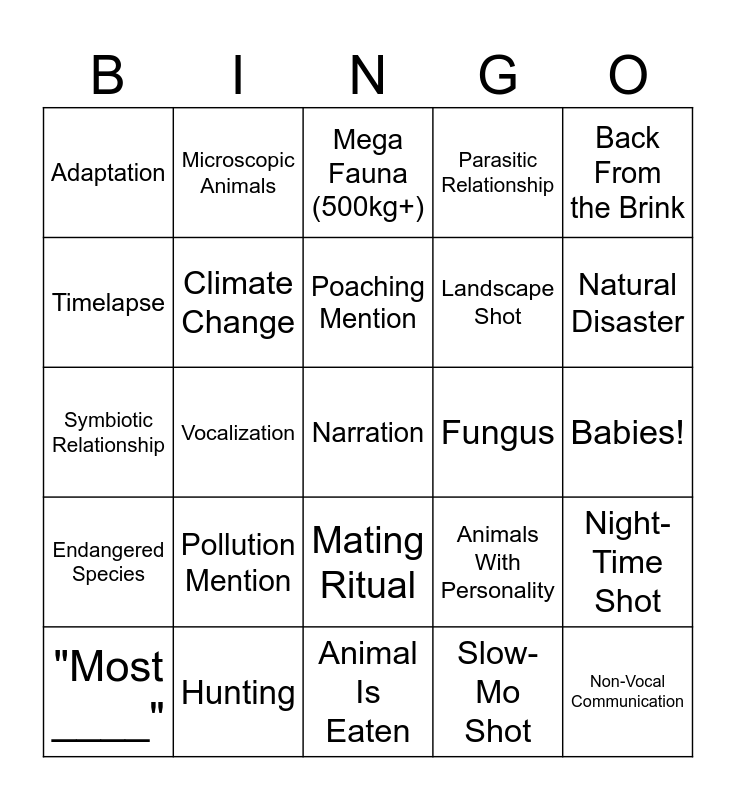 This bingo card has a free space and 28 words: Night-Time Shot, Zoomed Out Earth, Landscape Shot, Slow-Mo Shot, Timelapse, Mega Fauna (500kg+), Microscopic Animals, Endangered Species, Fungus, "Most ____", Symbiotic Relationship, Parasitic Relationship, Hunting, Animal Is Eaten, Natural Disaster, Extreme Temperature, Pollution Mention, Climate Change, Poaching Mention, Mating Ritual, Adaptation, Migration, Non-Vocal Communication, Vocalization, Babies!, Animals With Personality, Back From the Brink and Animal Breaks the 4th Wall.