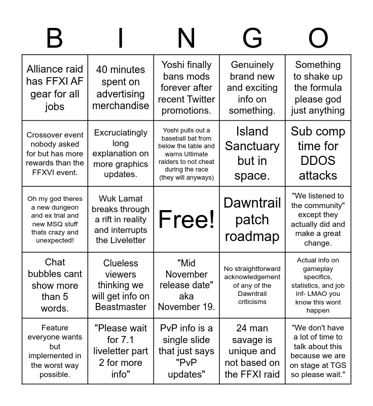 This bingo card has a free space and 24 words: Feature everyone wants but implemented in the worst way possible., Clueless viewers thinking we will get info on Beastmaster, Yoshi pulls out a baseball bat from below the table and warns Ultimate raiders to not cheat during the race (they will anyways), 24 man savage is unique and not based on the FFXI raid, Something to shake up the formula please god just anything, Alliance raid has FFXI AF gear for all jobs, 40 minutes spent on advertising merchandise, Yoshi finally bans mods forever after recent Twitter promotions., Dawntrail patch roadmap, "We listened to the community" except they actually did and make a great change., Oh my god theres a new dungeon and ex trial and new MSQ stuff thats crazy and unexpected!, Excruciatingly long explanation on more graphics updates., No straightforward acknowledgement of any of the Dawntrail criticisms, Actual info on gameplay specifics, statistics, and job inf- LMAO you know this wont happen, Crossover event nobody asked for but has more rewards than the FFXVI event., "Please wait for 7.1 liveletter part 2 for more info", PvP info is a single slide that just says "PvP updates", Genuinely brand new and exciting info on something., Sub comp time for DDOS attacks, Chat bubbles cant show more than 5 words., Wuk Lamat breaks through a rift in reality and interrupts the Liveletter, "Mid November release date" aka November 19., Island Sanctuary but in space. and "We don't have a lot of time to talk about this because we are on stage at TGS so please wait.".
