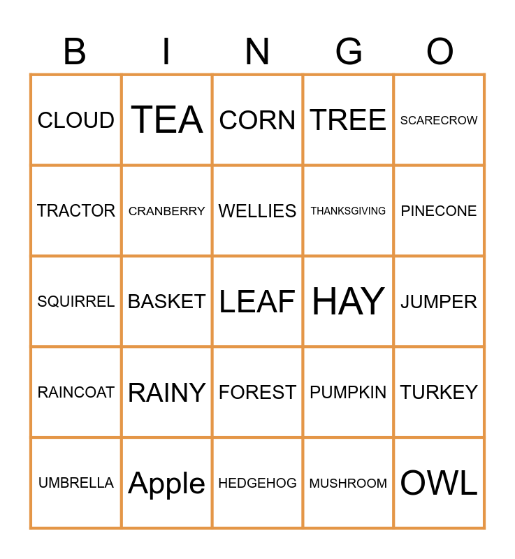 This bingo card has 30 words: Apple, APPLE PIE, BASKET, CHESTNUT, CLOUD, CORN, CRANBERRY, FOREST, HAY, HEDGEHOG, JUMPER, LEAF, MUSHROOM, OWL, PINECONE, PRESERVES, PUMPKIN, RAINCOAT, RAINY, SCARECROW, SQUIRREL, SUNFLOWER, TEA, THANKSGIVING, TRACTOR, TREE, TURKEY, UMBRELLA, WELLIES and WHEAT.