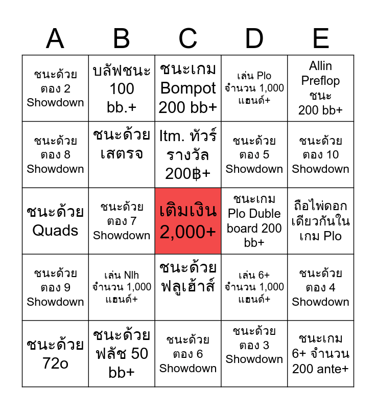 This bingo card has a free space and 24 words: ชนะด้วย 72o, เล่น Nlh จำนวน 1,000 แฮนด์+, Itm. ทัวร์รางวัล 200฿+, ชนะด้วยตอง 3 Showdown, Allin Preflop ชนะ 200 bb+, ชนะด้วยตอง 2 Showdown, บลัฟชนะ 100 bb.+, ชนะเกม Bompot 200 bb+, ชนะเกม Plo Duble board 200 bb+, ถือไพ่ดอกเดียวกันในเกม Plo, ชนะด้วย Quads, ชนะด้วย เสตรจ, เล่น 6+ จำนวน 1,000 แฮนด์+, ชนะด้วยตอง 4 Showdown, ชนะด้วยตอง 8 Showdown, ชนะด้วยฟลัช 50 bb+, ชนะด้วยตอง 6 Showdown, เล่น Plo จำนวน 1,000 แฮนด์+, ชนะด้วยตอง 10 Showdown, ชนะด้วยตอง 9 Showdown, ชนะด้วยตอง 7 Showdown, ชนะด้วยฟลูเฮ้าส์, ชนะด้วยตอง 5 Showdown and ชนะเกม 6+ จำนวน 200 ante+.