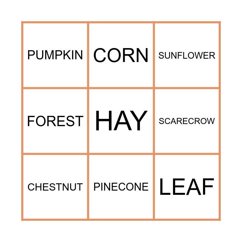 This bingo card has 14 words: ACORN, APPLE, CHESTNUT, CORN, FOREST, HAY, LEAF, MUSHROOM, PINECONE, PUMPKIN, RAINY, SCARECROW, SUNFLOWER and TREE.
