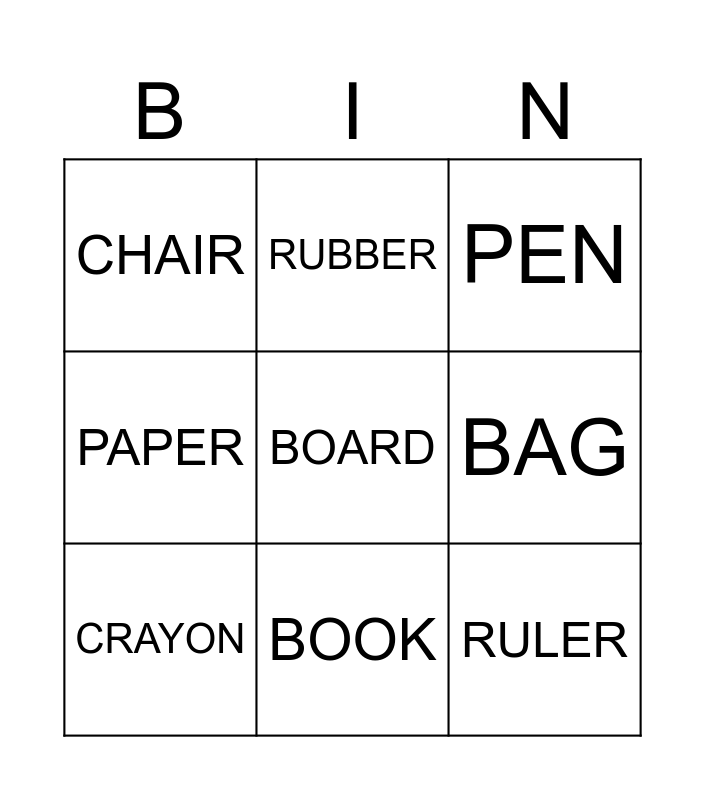 This bingo card has 14 words: Free!, CLASSMATE, CRAYON, RUBBER, PAPER, BOARD, RULER, DESK, BOOK, CHAIR, PENCIL, BAG, PEN and ENGLISH TEACHER.