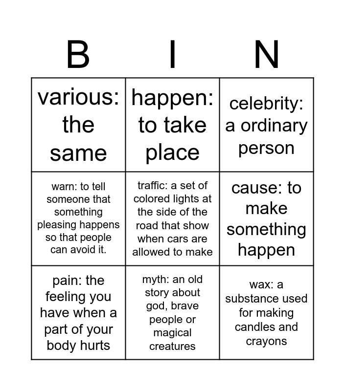 This bingo card has a free space and 8 words: cause: to make something happen, celebrity: a ordinary person, happen: to take place, pain: the feeling you have when a part of your body hurts, various: the same, wax: a substance used for making candles and crayons, warn: to tell someone that something pleasing happens so that people can avoid it. and myth: an old story about god, brave people or magical creatures.