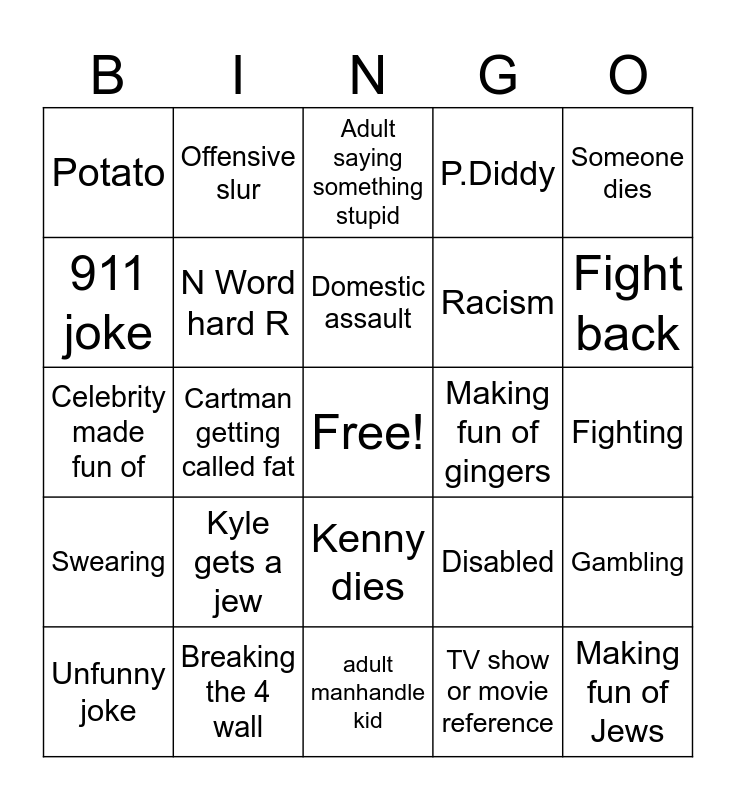 This bingo card has a free space and 24 words: Kyle gets a jew, Breaking the 4 wall, Domestic assault, Unfunny joke, Someone dies, Potato, 911 joke, Offensive slur, Making fun of gingers, Kenny dies, Racism, Celebrity made fun of, Disabled, Gambling, N Word hard R, TV show or movie reference, Fighting, Adult saying something stupid, Fight back, Cartman getting called fat, Making fun of Jews, Swearing, P.Diddy and adult manhandle kid.