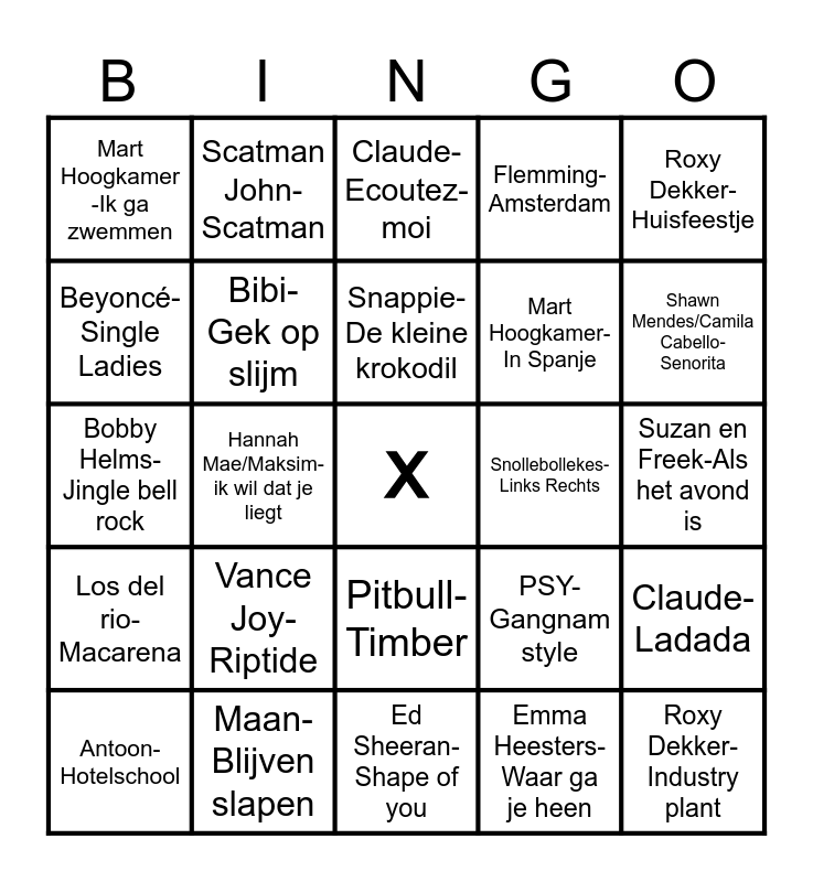 This bingo card has a free space and 44 words: Yves Berendse-Terug in de tijd, Roxy Dekker-Industry plant, Bankzitters-Entourage, Antoon-Hotelschool, Sabrina Carpenter-Espresso, Emma Heesters-Waar ga je heen, Claude-Ecoutez-moi, Suzan en Freek-Sapeloosheid, Roxy Dekker-Huisfeestje, Maan-Blijven slapen, Flemming-Amsterdam, Snollebollekes-Links Rechts, Pitbull-Timber, Vance Joy-Riptide, Wham-Wake me up, Ed Sheeran-Shape of you, Tones and I-Dance monkey, Bobby Helms-Jingle bell rock, Ava Max-Sweet but psycho, Shawn Mendes/Camila Cabello-Senorita, Scatman John-Scatman, Taylor Swift-Shake it off, Katy Perry-Firework, Mart Hoogkamer -Ik ga zwemmen, Pitbull-Fireball, Suzan en Freek-Als het avond is, Carly Rae Jepsen-Call me maybe, Madcon-Don't worry, PSY-Gangnam style, Los del rio-Macarena, Gummybear, Claude-Ladada, Pulcino pio-kuikentje piep, El Chombo-Dame tu cosita, Hannah Mae/Maksim-ik wil dat je liegt, Roxy Dekker/Ronnie Flex-Gaan we weg?, Emma Heesters/Rolf Sanchez-Contigo, Aqua-Barbie Girl, Snappie-De kleine krokodil, Beyoncé-Single Ladies, Mart Hoogkamer-In Spanje, Flemming-Automatisch, Bibi-Gek op slijm and Will.i.am-I like to move it.