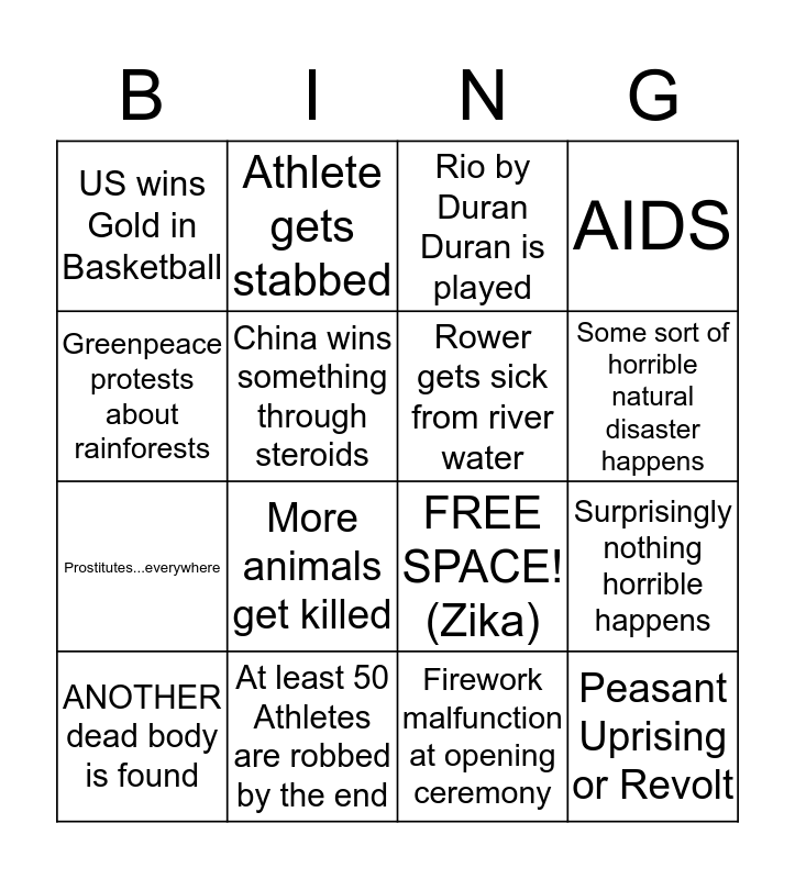 This bingo card has a free space and 15 words: ANOTHER dead body is found, Peasant Uprising or Revolt, Rio by Duran Duran is played, US wins Gold in Basketball, Some sort of horrible natural disaster happens, Greenpeace protests about rainforests, More animals get killed, Firework malfunction at opening ceremony, China wins something through steroids, Prostitutes...everywhere, Surprisingly nothing horrible happens, AIDS, Rower gets sick from river water, Athlete gets stabbed and At least 50 Athletes are robbed by the end.