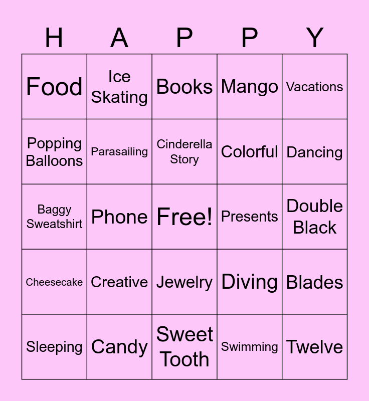This bingo card has a free space and 48 words: Zoey, Twelve, Lavender, Sweet Tooth, Creative, Artsy, Ice Skating, Volleyball, Popping Balloons, Bunny, Parasailing, Mango, Blades, Diving, Family, TV, Cinderella Story, Presents, Starbucks, Vacations, Phone, Swimming, Food, Colorful, Friendship Bracelets, Dancing, Sleeping, Big Sister, Jewelry, Cheesecake, Into the Woods, Fall/Autumn, Sephora, Lululemon, Candy, Movies, Boba, Double Black, Skiing, Mismatch, Skittles, Strawberry Acai, Books, Legos, Baggy Sweatshirt, Beber, Water Skiing and Friends.