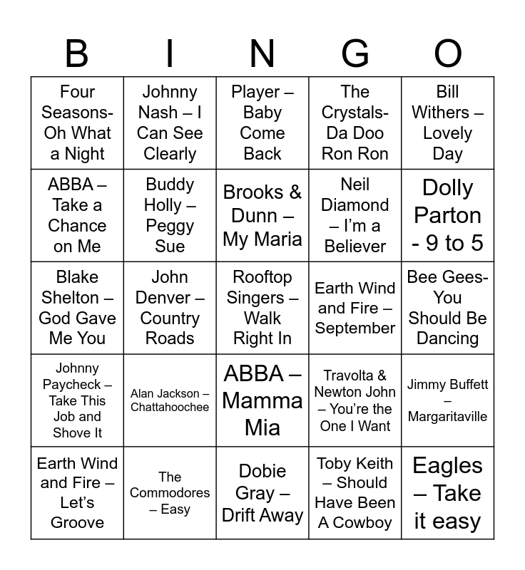 This bingo card has 80 words: Jim Croce- Bad Bad Leroy Brown, Otis Redding – Dock of the Bay, Player – Baby Come Back, Bee Gees – Stayin Alive, The Ronettes – Be My Baby, Fleetwood Mac – Go your own way, Elton John – Crocodile Rock, Carly Simon – You’re So Vain, Helen Reddy – Delta Dawn, Leslie Gore – Its my Party, Four Seasons- Walk like a Man, Sam Cooke – Another Saturday Night, The Crystals- Da Doo Ron Ron, Four Seasons- Oh What a Night, ABBA – Dancing Queen, ABBA – Take a Chance on Me, Alabama – Dixieland Delight, Alan Jackson – Chattahoochee, Aretha Franklin – Respect, Bee Gees- You Should Be Dancing, Bill Withers – Lean On Me, Bill Withers – Lovely Day, Blake Shelton – God Gave Me You, Brooks & Dunn – My Maria, Buddy Holly – Peggy Sue, Harry Chapin – Cats in the Cradle, Simon and Garfunkel- Cecilia, The Dixie Cups – Chapel of Love, Darius Rucker – Wagon Wheel, Dixie Chicks – Goodbye Earl, Dolly Parton - 9 to 5, Dolly Parton – Jolene, Dobie Gray – Drift Away, Eagles – Take it easy, Earth Wind and Fire – Let’s Groove, Earth Wind and Fire – September, Elvis Presley – Jailhouse Rock, Elvis Presley – Suspicious Minds, Nitty Gritty Dirt Band – Fishin in the Dark, Rooftop Singers – Walk Right In, Garth Brooks – Friends In Low Places, George Strait – I Cross My Heart, Gloria Gaynor – I Will Survive, Harry Belafonte – Jump in The Line, The Beatles – Help!, Johnny Nash – I Can See Clearly, Sonny and Cher – I Got u babe, Neil Diamond – Sweet Caroline, Frankie Yankovic – Heaven There is No Beer, Jason Aldean – Dirt Road Anthem, Jimmy Buffett – Margaritaville, John Denver – Country Roads, Travolta & Newton John – You’re the One I Want, Johnny Cash – Folsom Prison Blues, Kenny Chesney – She Thinks My Tractor’s Sexy, Kool and the Gang – Celebration, The Bellamy Brothers - Let Your Love Flow, Luke Bryan – Play It Again, Ben E. King – Stand By Me, ABBA – Mamma Mia, Neil Diamond – I’m a Believer, Ray Charles – Hit The Road Jack, Glen Campbell – Rhinestone Cowboy, Maxine Nightingale – Right Back Where We Started From, Shaboozey – A Bar Song (Tipsy), Shania Twain – Any Man of Mine, Shania Twain – Whose Bed have your Boots Been Under, Steve Earle – Copperhead Road, Sugarland – Stay, Gordon Lightfoot – Sundown, Johnny Paycheck – Take This Job and Shove It, The Commodores – Easy, The Supremes – Where Did Our Love Go, The Temptations The Way You The Things You Do, The Temptations – Aint To proud To Beg, Tim McGraw – I Like It I Love it, Toby Keith – Should Have Been A Cowboy, Tom Jones – What’s New Pussycat, Tom Jones – Its Not Unusual and Zac Brown Band – Chicken Fried.