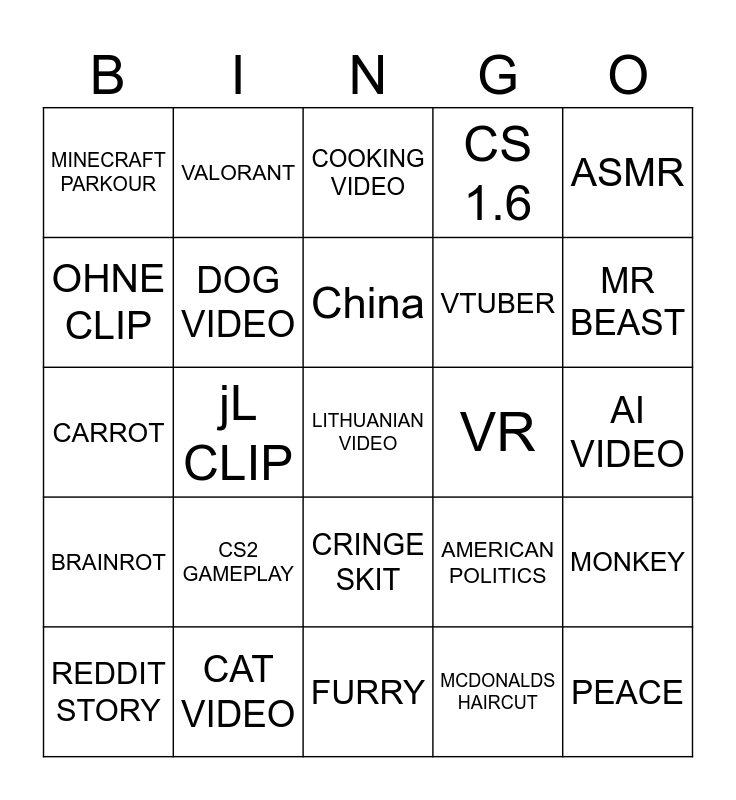 This bingo card has a free space and 24 words: CS2 GAMEPLAY, CAT VIDEO, China, REDDIT STORY, ASMR, MINECRAFT PARKOUR, OHNE CLIP, VALORANT, VR, CRINGE SKIT, VTUBER, CARROT, AMERICAN POLITICS, MONKEY, DOG VIDEO, MCDONALDS HAIRCUT, AI VIDEO, COOKING VIDEO, MR BEAST, jL CLIP, PEACE, BRAINROT, CS 1.6 and FURRY.