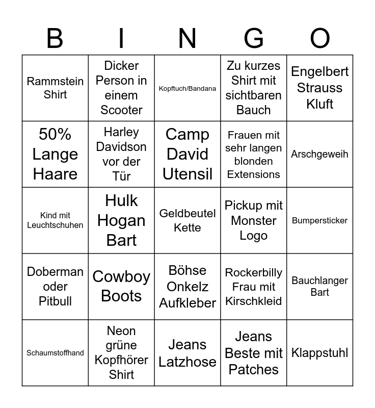 This bingo card has a free space and 24 words: Cowboy Boots, Neon grüne Kopfhörer Shirt, Camp David Utensil, Schaumstoffhand, Engelbert Strauss Kluft, Rammstein Shirt, 50% Lange Haare, Dicker Person in einem Scooter, Pickup mit Monster Logo, Böhse Onkelz Aufkleber, Frauen mit sehr langen blonden Extensions, Kind mit Leuchtschuhen, Rockerbilly Frau mit Kirschkleid, Bauchlanger Bart, Harley Davidson vor der Tür, Jeans Beste mit Patches, Bumpersticker, Kopftuch/Bandana, Arschgeweih, Hulk Hogan Bart, Klappstuhl, Doberman oder Pitbull, Zu kurzes Shirt mit sichtbaren Bauch and Jeans Latzhose.