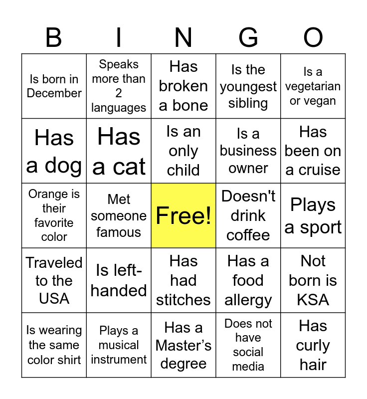 This bingo card has a free space and 24 words: Is left-handed, Plays a musical instrument, Is an only child, Is wearing the same color shirt, Is a vegetarian or vegan, Is born in December, Has a dog, Speaks more than 2 languages, Doesn't drink coffee, Has had stitches, Is a business owner, Orange is their favorite color, Has a food allergy, Not born is KSA, Has a cat, Does not have social media, Plays a sport, Has broken a bone, Has been on a cruise, Met someone famous, Has curly hair, Traveled to the USA, Is the youngest sibling and Has a Master’s degree.
