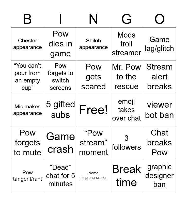 This bingo card has a free space and 30 words: “Dead” chat for 5 minutes, 1 sub, 5 gifted subs, 100 bits, Chester appearance, Shiloh appearance, Pow forgets to switch screens, “Pow stream” moment, emoji takes over chat, Name mispronunciation, viewer bot ban, graphic designer ban, Break time, Pow complains about glitter, Stream alert breaks, Raid, 3 followers, Pow forgets to mute, Game crash, Game lag/glitch, Mic makes appearance, Pow jumbles her words, Pow dies in game, Mr. Pow to the rescue, “You can’t pour from an empty cup”, Mods troll streamer, Chat breaks Pow, Pow tangent/rant, Pow gets scared and Gfuel plug.